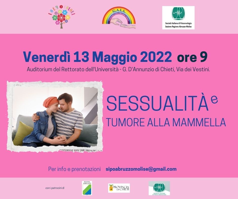 Venerdì 13 Maggio 2022 dalle ore 9, presso l’Auditorium del Rettorato dell’Università G. D’annunzio di Chieti, in via dei Vestini, si terrà il convegno dal titolo “Sessualità e tumore alla mammella”. L’evento, con l’Alto Patrocinio della Regione Abruzzo, della Provincia di Chieti e dalla SIPO Nazionale, è stato ideato e organizzato dalla SIPO Abruzzo-Molise insieme alle associazioni territoriali Lory a Colori e G.A.I.A. Onlus, impegnate nel progetto per  l’acquisto del Monnalisa Touch da donare nel reparto di Ginecologia dell’Ospedale “G. Bernabeo” di Ortona