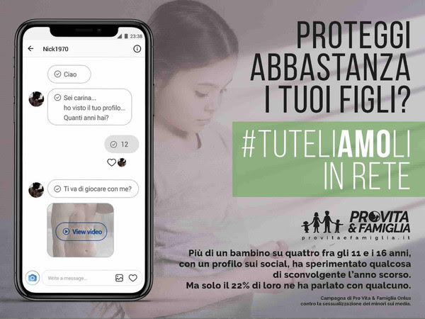 «La sessualità sui media è un dramma che colpisce sempre più spesso i nostri bambini e li espone a rischi di pornografia, adescamenti e abusi. Gli adulti proteggono abbastanza i minori?». Così Jacopo Coghe, Portavoce di Pro Vita & Famiglia, lancia la nuova campagna di affissioni che parte oggi per poi coprire, nelle prossime settimane, i principali capoluoghi italiani.