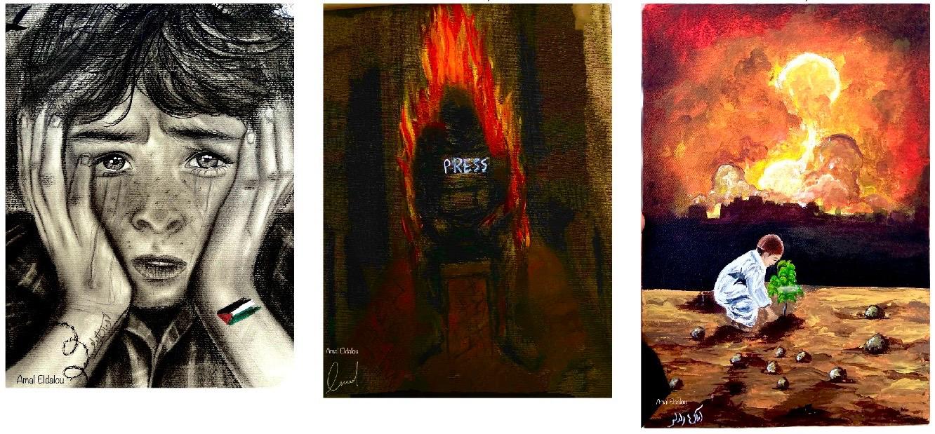 Quindici opere, gentilmente concesse da quattro artiste contemporanee di Gaza, sono state esposte nel chiostro del convento. Di seguito sono riportati i nomi delle artiste e i loro account Instagram, attraverso i quali presentano la loro arte: