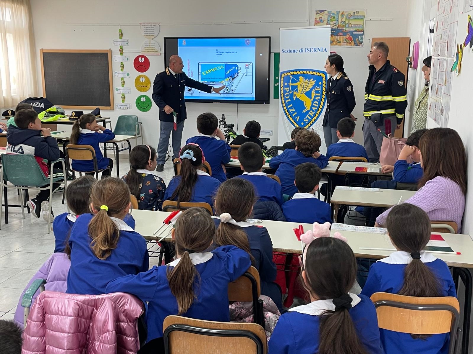 Continuano le campagne di sicurezza stradale organizzate dalla Polizia di Stato in provincia di Isernia. Questa mattina è toccato agli alunni della scuola primaria del1’Istituto Don Luigi Testa di Venafro, dove gli operatori della Sezione Polizia Stradale di Isernia hanno tenuto una lezione teorica/pratica ed interattiva, incentrata sui corretti comportamenti da adottare alla guida della bicicletta.