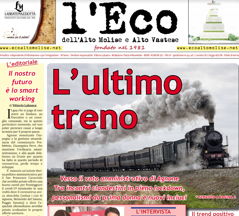 Le elezioni comunali di Agnone attese per il mese di settembre, sotto la lente d’ingrandimento de l’Eco Alto Molise – Vastese. Il mensile torna in edicola e lo fa cercando di capire quali potranno essere gli aspiranti a sindaco. A riguardo intervista a tutto campo di Italo Marinelli a Daniele Saia, capogruppo del centrosinistra e in trampolino di lancio per lo scranno più alto a Palazzo San Francesco. Ed ancora, nelle 12 pagine spazio al mercato immobiliare con Decio Galasso che conferma l’interessamento di sempre più stranieri all’acquisto di abitazioni in alto Molise. Tutti i numeri della rete di solidarietà messa in campo durante l’emergenza sanitaria da Protezione civile e associazioni di volontariato. Poi lo sport con il presidente Marco Colaizzo intenzionato a lasciare il timone dell’Olympia Agnonese nel campionato di serie D. Ma tante altre sono le curiosità, i ricordi, le foto inedite che troverete sul appena numero sbarcato in edicola. Non resta che correre ad acquistare un copia.
