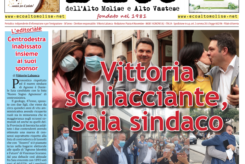 Il centrosinistra si riprende il Comune di Agnone: Daniele Saia il nuovo sindaco. L’andamento del voto, i commenti, la festa, le reazioni degli sconfitti e la nuova giunta. E’ in uscita nelle edicole il nuovo numero de l’Eco de l’Alto Molise – Vastese che dedica uno speciale sulle comunali di Agnone e apre una finestra su quanto accaduto a Poggio Sannita e Sant’Angelo del Pesco. Ed ancora: foto a colori, curiosità ed una intervista esclusiva, a firma di Italo Marinelli, al pittore-scultore Ruggiero Di Lollo che parla della sua carriera professionale, ma anche e soprattutto di passato, degli amici, di frati francescani e del rapporto che mantiene con Agnone. Per lo sport, la notizia dell’imprenditore capracottese, neo patron dell’Arezzo, Giuseppe Monaco pronto a rilevare un’Agnonese partita malissimo nel campionato di serie D.  Questi solo alcuni dei temi trattati nelle 12 pagine de l’Eco, un giornale libero e senza padroni! Correte in edicola a prenotare una copia.