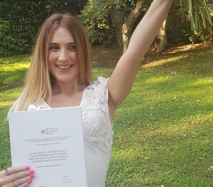 “La disabilità intellettiva: caratteristiche cliniche e psicoterapia efficace nella gestione delle emozioni”. E’ il titolo della tesi sostenuta da Giusy Iaciancio all’Università Europea di Roma nell’ambito del corso di formazione per il conseguimento della specializzazione per le attività di sostegno didattico agli alunni con disabilità nella scuola secondaria di secondo grado. Alla brillante Giusy Iaciancio le congratulazioni di parenti, amici e quelle della nostra redazione.