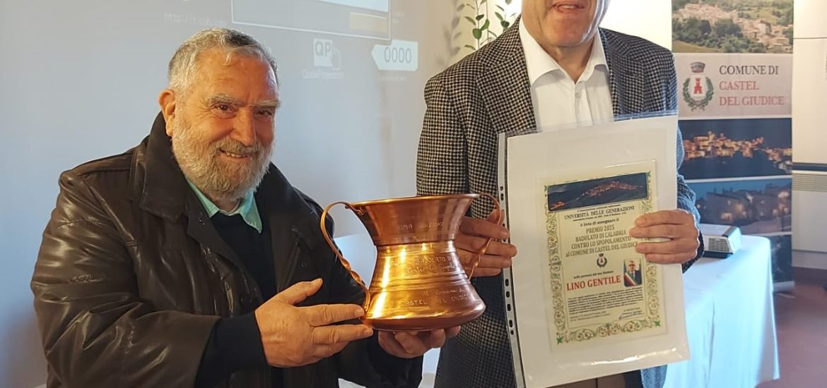 Così per mantenere alta l’attenzione e per incoraggiare tutti, cittadini e sindaci a reagire alla desertificazione e a lottare strenuamente per la salvezza delle proprie comunità ma anche dei millenari ecosistemi, Domenico Lanciano (autore proprio 39 anni fa della vicenda “Badolato paese in vendita”) ha pensato bene di istituire due distinti riconoscimenti: il “Premio Agnone del Molise contro lo spopolamento” (assegnato martedì 7 ottobre scorso alla Caritas della Diocesi di Trivento, nella persona del suo storico direttore don Alberto Conti) e il “Premio Badolato di Calabria contro lo spopolamento” assegnato l’11 ottobre scorso durante un convegno sulla salvezza delle aree interne della dorsale appenninica, alpina e delle isole, tenendo presente che il problema non è soltanto italiano, ma europeo e mondiale là dove l’industrializzazione e la globalizzazione hanno semidistrutto i territori, abbandonandoli a sé stessi. Così il sindaco di Castel del Giudice, Lino Gentile, ha ricevuto dalle mani dello stesso Domenico Lanciano la pergamena della prima edizione del “Premio Badolato di Calabria contro lo spopolamento” accompagnata da una pregevole tina di rame (simbolo di comunità) dell’artigiano Filippo Catolino e un bel poster con il panorama del borgo di Badolato firmato da Gori Campese.