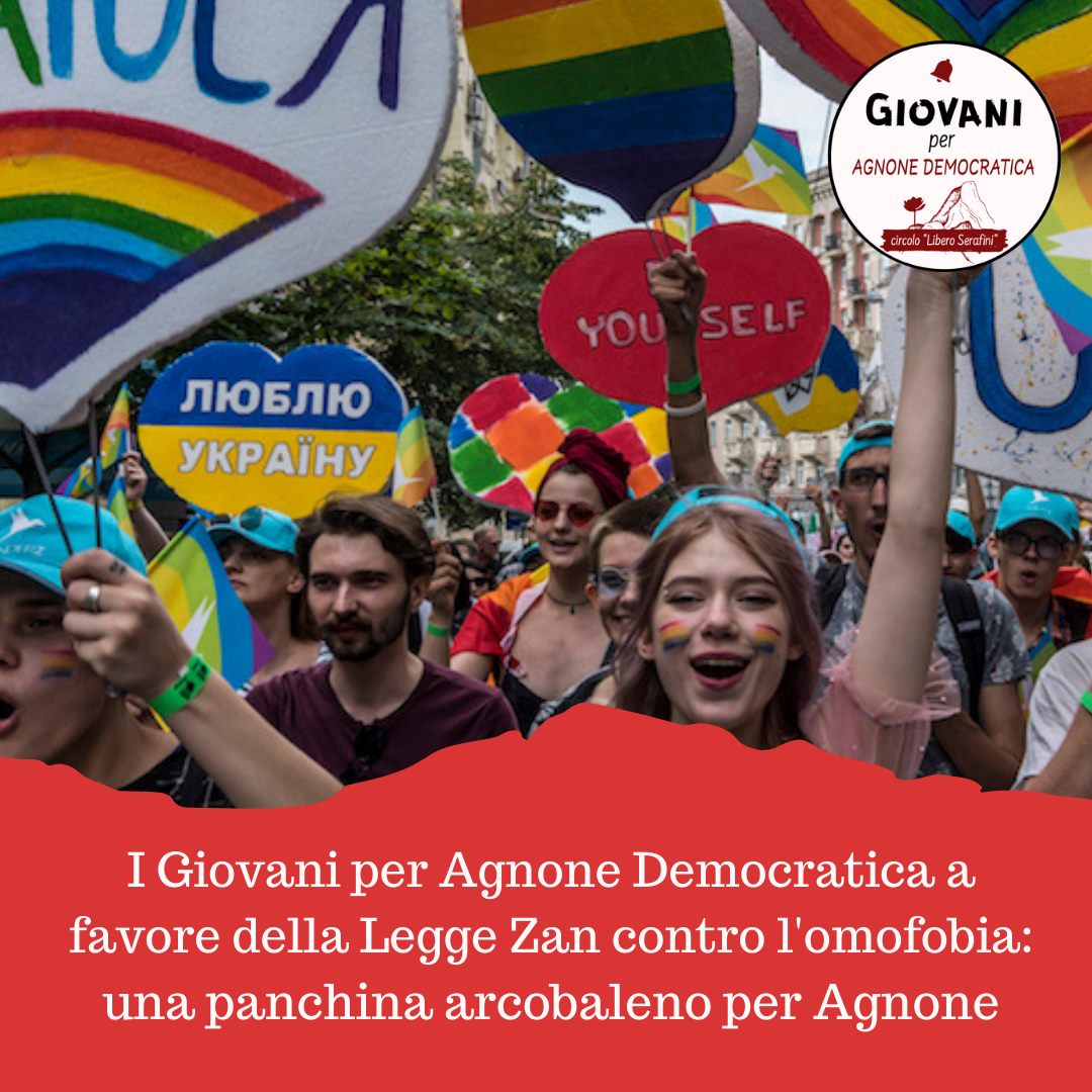 «Stamattina abbiamo presentato richiesta formale al Comune di Agnone per verniciare una panchina del “Belvedere Ripa” con i colori della bandiera LGBTIQ+ in occasione della votazione in Parlamento per l’approvazione della legge Zan: “Modifiche agli articoli 604-bis e 604-ter del codice penale, in materia di violenza o discriminazione per motivi di orientamento sessuale o identità di genere”».