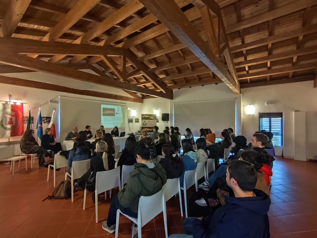 Successivamente, Luciana Petrocelli ha condotto gli studenti al Centro Studi Casa Frezza, di cui è responsabile, associazione che gioca un ruolo cruciale sul territorio con attività di doposcuola, ripetizioni, potenziamento studio, corsi, preparazione esami, centro di ricerca, co-working, biblioteca, eventi culturali (tra cui la rassegna letteraria Radicalmente) e attività ludiche. Lo Study Trip si è concluso con un pranzo negli spazi dell’Azienda Agricola Melise, dove Emanuele Scocchera ha illustrato agli studenti il processo di trasformazione in meleti biologici di circa 50 ettari di terreni in disuso, e la riscoperta e la valorizzazione di oltre 60 varietà antiche autoctone di mele, oggetto di sperimentazione nel Giardino delle Mele Antiche, soffermandosi anche sulla storia del birrificio agricolo Malto Lento, le cui tipologie di birra nascono dall’orzo coltivato a Castel del Giudice.