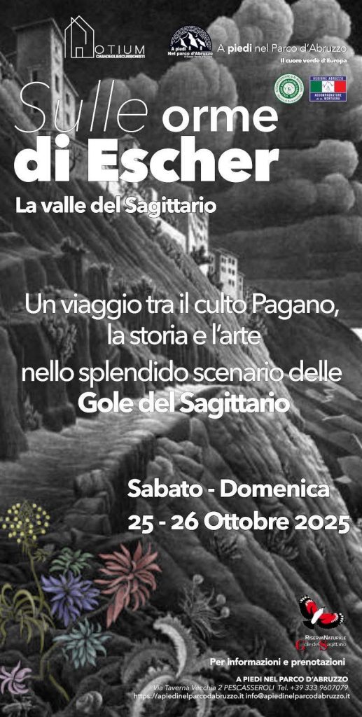 Tanti passi, ma anche tanta cultura. Maurits Cornelis Escher è stato un incisore e grafico olandese, vissuto tra la fine dell’Ottocento e i primi anni ’70 del Novecento. La sua arte è legata indissolubilmente all’Abruzzo. Escher visitò in tre diverse occasioni tra il 1928 e il 1935 la regione. Rimase rapito dal fascino mozzafiato degli splendidi paesi arroccati o adagiati sui crinali delle montagne, immersi nella lussureggiante vegetazione e rimasti quasi immutati fino a oggi. Frutto di questi viaggi furono 28 schizzi che dovevano servire a realizzare un libro illustrato sull’Abruzzo, che non fu mai pubblicato.