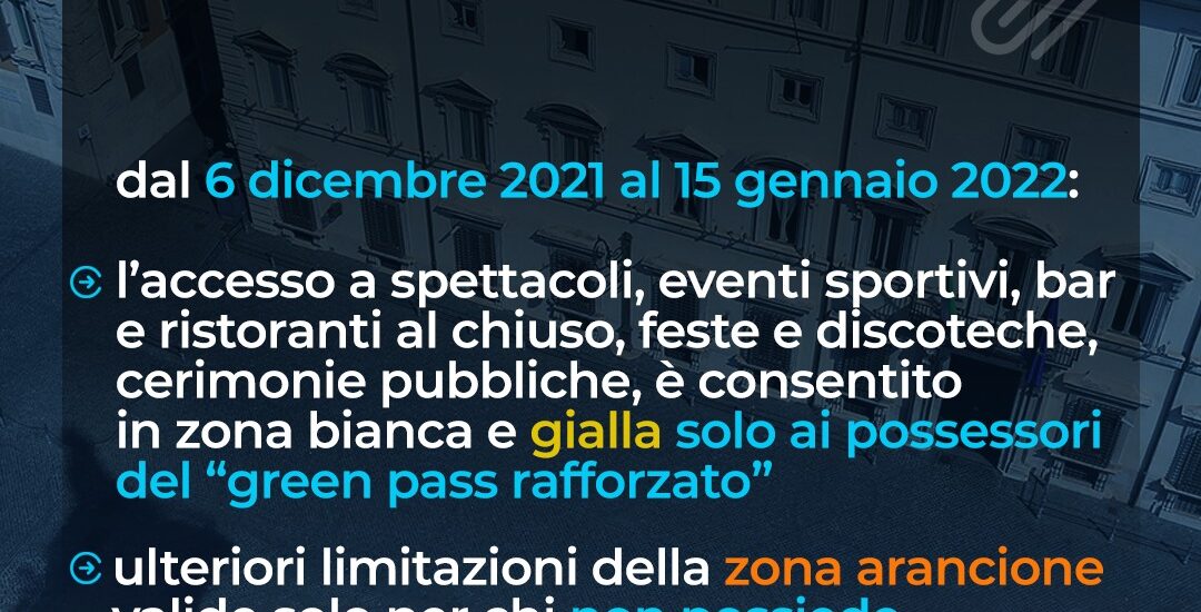 “In base alle disposizioni nazionali in vigore per il contenimento della diffusione dell’epidemia da Covid-19 e alle ordinanze del ministro della Salute, si applicano le misure previste”, si legge sul sito. Resta inteso che valgono, si precisa ancora, “per la zona bianca ad Abruzzo, Basilicata, Calabria, Campania, Emilia Romagna, Lazio, Liguria, Lombardia, Marche, Molise, Piemonte, Provincia Autonoma di Trento, Puglia, Sardegna, Sicilia, Toscana, Umbria, Valle d’Aosta, Veneto” e “per la zona gialla al Friuli Venezia Giulia e, da lunedì 6 dicembre, alla Provincia Autonoma di Bolzano”.