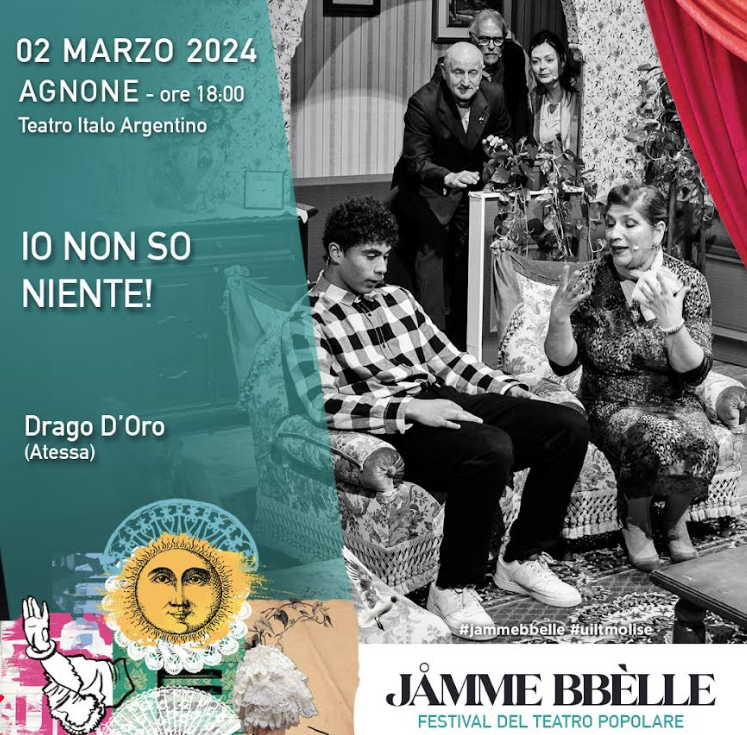 Dopo i successi del debutto campobassano e del doppio appuntamento termolese (clamorosi sold out), Jamme Bbelle arriva quindi in Alto Molise con la compagnia Drago D’Oro di Atessa (Chieti), attiva ormai da 16 anni e molto nota in Abruzzo per le sue commedie dialettali.
