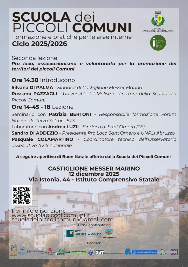 Come al solito la lezione sarà seguita dalla parte laboratoriale, che per l’occasione ospiterà il sindaco di Sant’Omero (TE), Andrea Luzii accompagnato dal presidente della Pro Loco del centro teramano e presidente UNPLI Abruzzo, Sandro Di Addezio che illustreranno l’esperienza virtuosa di collaborazione tra la Pro Loco e l’amministrazione comunale, peraltro in linea con il trend regionale: in Abruzzo, il 97% di queste associazioni dichiara di collaborare fattivamente con i comuni. Interverrà anche Pasquale Colamartino, coordinatore tecnico dell’Osservatorio associativo di AVIS nazionale, per raccontare come questa rete associativa si interfaccia con le comunità che vivono nelle aree interne. Gli incontri sono aperti a tutti ed è possibile iscriversi direttamente visitando il seguente link:  https://scuolapiccolicomuni.it/iscrizioni_2526/