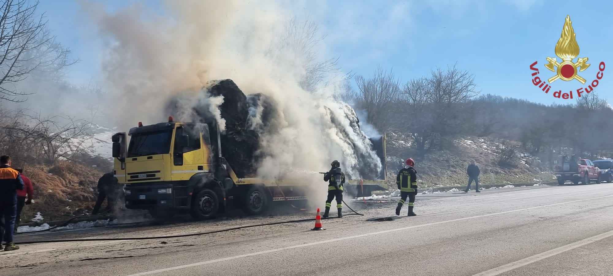 Diverse balle di paglia trasportate da un tir sono andate a fuoco sulla SS650 Trignina all’altezza di Pesche (IS). Il rogo ha investito l’intero mezzo e prodotto un denso fumo che ha invaso la carreggiata paralizzando il traffico in entrambe le direzioni. Le operazioni di spegnimento sono state svolte da parte dei Vigili del Fuoco di Isernia, intervenuti precisamente con due squadre dalla sede centrale e una autobotte dal distaccamento di Agnone. Per accelerare le operazioni di “smassamento” del materiale è intervenuto anche un mezzo privato reperito tramite i Carabinieri. Presente anche personale Anas per quanto di competenza.