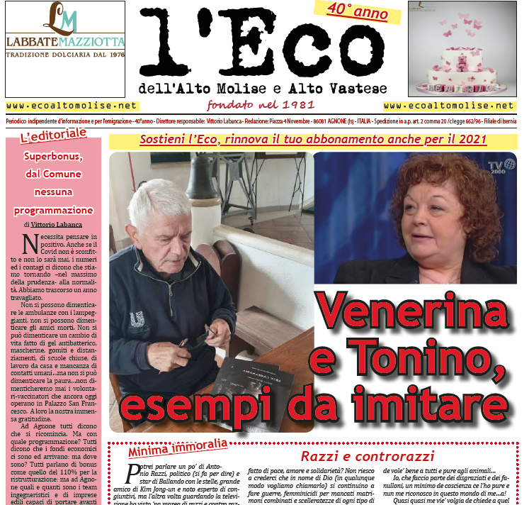 Le storie appassionanti di Tonino Delli Quadri e Venerina Labbate aprono il nuovo numero de l’Eco de l’Alto Molise – Vastese in uscita nelle edicole. A raccontarle con dovizia di particolari il collega Italo Marinelli che ha incontrato…