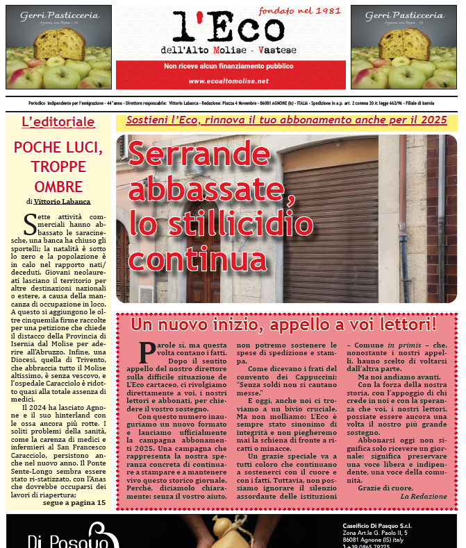 Con un nuovo formato tabloid, più pagine a colori e un’offerta ancora più ricca di notizie, torna in edicola il mensile L’Eco de l’Alto Molise – Vastese. La redazione si prepara ad affrontare una nuova sfida, puntando sulla fedeltà di lettori e abbonati, il cui sostegno sarà fondamentale per far fronte ai crescenti costi di stampa e spedizione.