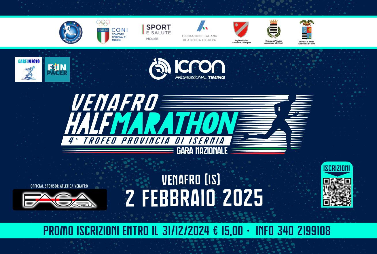 Torna la HALF MARATHON 4° Trofeo Provincia di Isernia – Città di Venafro. Come per la passata edizione la gara nazionale Bronze andrà in scena la prima domenica di febbraio e precisamente il 2 grazie alla collaudata regia della Faga Gioielli Atletica Venafro, società organizzatrice e punto di riferimento dell’atletica molisana per la corsa su strada.