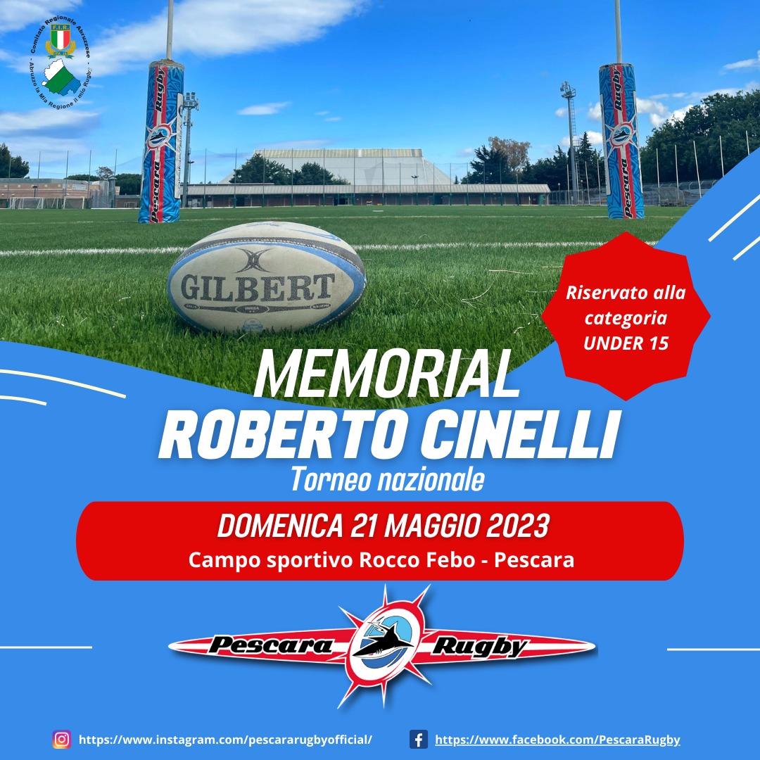 Un torneo di rugby, riservato ad atleti di categoria Under 15, in memoria di Roberto Cinelli, azzurro numero 223, ex allenatore e dirigente del Pescara, scomparso nel 2017. Il Memorial Roberto Cinelli, giunto alla sua seconda edizione, è organizzato dalla società sportiva Pescara Rugby Asd e si svolgerà nel capoluogo adriatico, domenica 21 maggio 2023, dalle ore 10 alle ore 17, presso il Campo Sportivo Rocco Febo.
