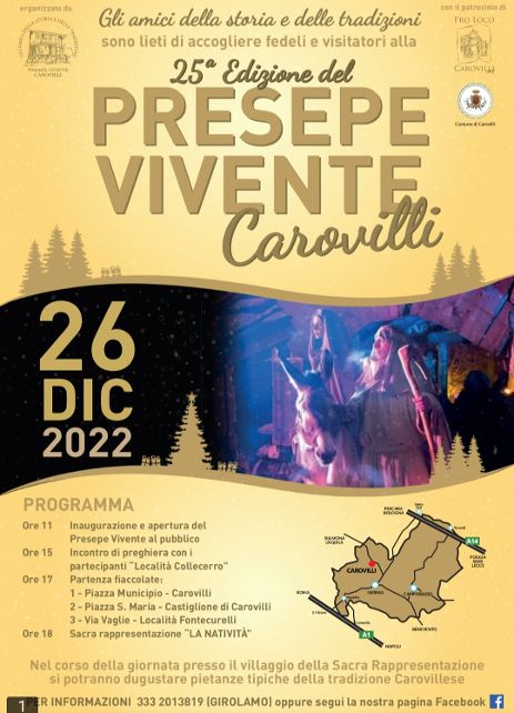 «La preparazione e la cura dei dettagli sono diventati un vanto per il piccolo centro montano dell’Alto Molise, in occasione della messa in scena del 26 dicembre. – spiegano dall’associazione culturale – Veri tesori anche di accoglienza e dedizione, luoghi suggestivi da vivere lentamente in cui il sapore delle tradizioni si mescola con la religiosità dell’evento. La ricostruzione del villaggio è minuziosa e con moltissimi figuranti, l’accoglienza è cordiale e semplice come d’abitudine in queste terre genuine dove lo spirito di comunità è molto forte. Anche quest’anno, in occasione della venticinquesima edizione, nessun dettaglio è stato trascurato. A Carovilli è davvero tutto pronto per l’ormai tradizionale appuntamento con il presepe vivente».
