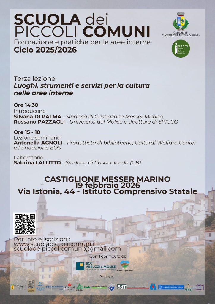 La cultura quale asset strategico per lo sviluppo locale e nelle aree periferiche è il tema del prossimo incontro alla Scuola dei piccoli Comuni (SPICCO) di Castiglione Messer Marino (CH). Appuntamento giovedì 19 febbraio prossimo, alle 14,30, come di consueto nell’aula magna dell’Istituto comprensivo statale (Via Istonia, 44). La lezione sarà tenuta da Antonella Agnoli, progettista di biblioteche, tra le altre cose assessora alla cultura del Comune di Lecce nel biennio 2017/2018 e già componente il Consiglio superiore dei beni culturali.