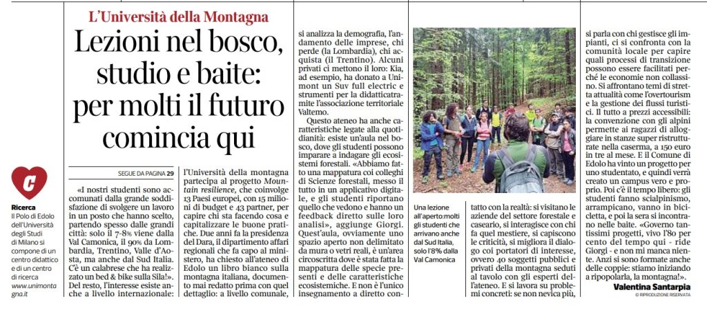 Il polo universitario di Edolo si distingue nettamente da altre esperienze montane. “Quelle – sottolinea Giorgi nell’intervista a Valentina Santarpia – sono cittadine, hanno tutti i servizi, sono densamente abitate. Il 90% dei Comuni di montagna del nostro Paese invece ha meno di 5 mila residenti, soffre dello spopolamento, della perdita di competitività, dell’invecchiamento della popolazione”.