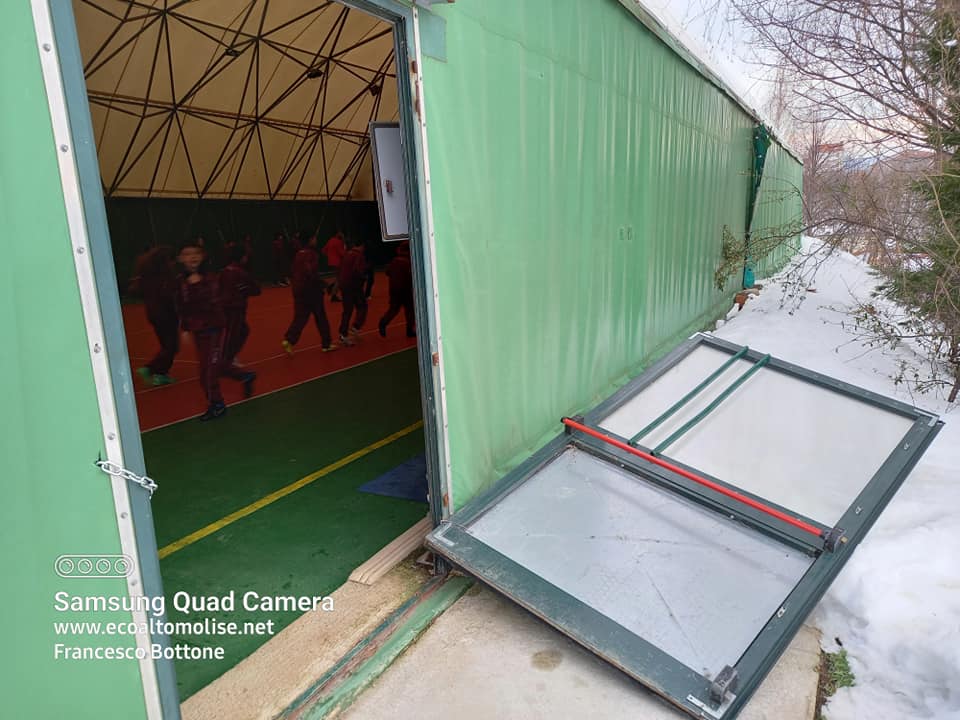 Città di Agnone, non Baghdad, pomeriggio di ieri, impianti sportivi nei pressi dell’ormai cadente palazzetto dello sport. Il “Civitelle” è impraticabile a causa del manto nevoso che lo copre nella sua interezza. Tutte le attività della prima squadra e della scuola calcio sono dirottate temporaneamente presso il campetto coperto nei pressi dello chalet. La porta di ingresso è inutilizzata, forse per la neve che nessuno ha rimosso o piuttosto perché pare non si riesca più ad aprire. Si utilizza, per accedere alla struttura pagata con soldi pubblici, l’uscita di emergenza. E già questo rappresenta una anomalia e probabilmente anche una violazione alle norme di sicurezza.