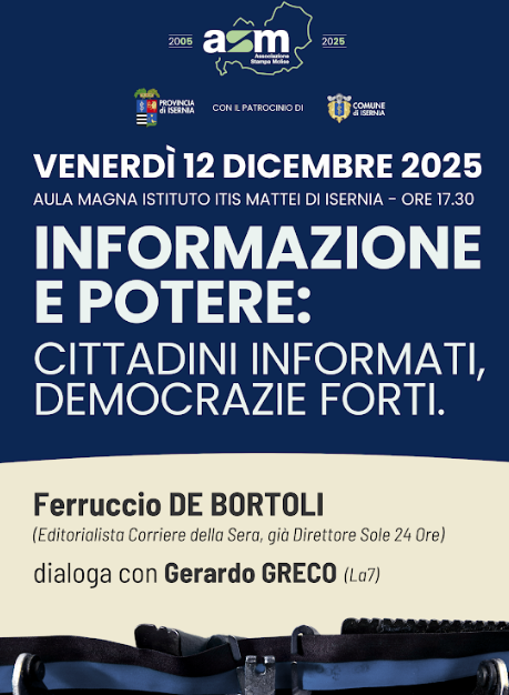 Nuovo appuntamento pubblico dell’Associazione della stampa del Molise per festeggiare il ventennale dalla fondazione. A Isernia, venerdì 12 dicembre, alle ore 17.30, nell’aula magna dell’Itis Mattei, ospiteremo Ferruccio De Bortoli (Sole 24 Ore e Corriere della Sera), uno dei…