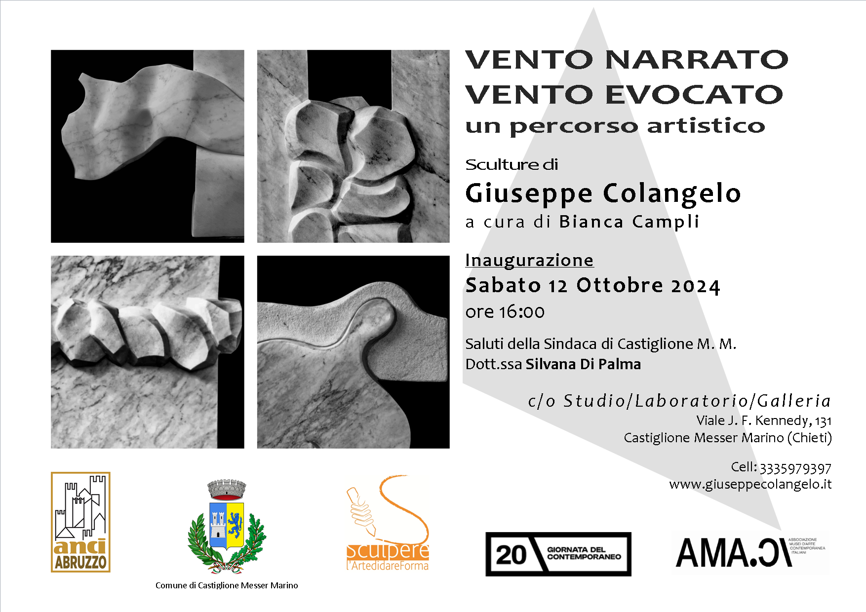 Sabato 12 ottobre 2024 alle ore 16 l’inaugurazione della mostra VENTO NARRATO VENTO EVOCATO: un percorso artistico, Sculture di Giuseppe Colangelo a cura di Bianca Campli presso lo studio/laboratorio/galleria, Fonte d’Ambra, in Viale Kennedy, 131 a Castiglione Messer Marino (CH); quest’anno gode del patrocinio dell’ANCI-Abruzzo e del Comune di Castiglione Messer Marino (CH).
