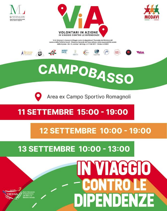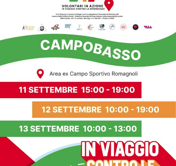 Campobasso ospita una delle 12 tappe del truck tour nazionale del progetto “Via-Volontari in azione – in Viaggio contro le dipendenze”, promosso dall’Associazione Modavi di Salerno e finanziato dal Ministero del Lavoro e delle Politiche sociali. Obiettivo dell’iniziativa è quello di promuovere il volontariato e la lotta alle dipendenze, sensibilizzando soprattutto i giovani sotto i trent’anni.