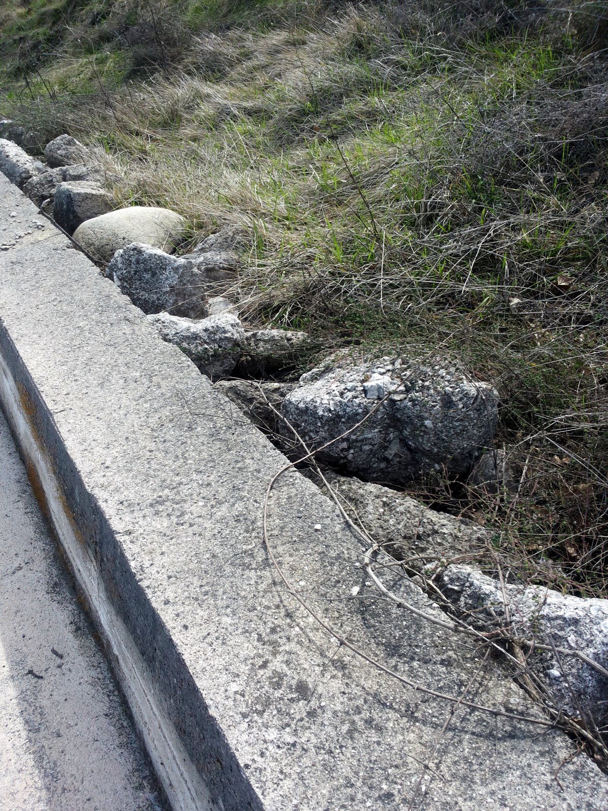 Purtroppo, Nicola ha ragione. Ci guardiamo introno e vediamo che nelle scarpate è stata buttato terriccio o, addirittura, a fianco dei guard rail. In un tratto, addirittura, i rifiuti sono tanto alti quanto la barriera.