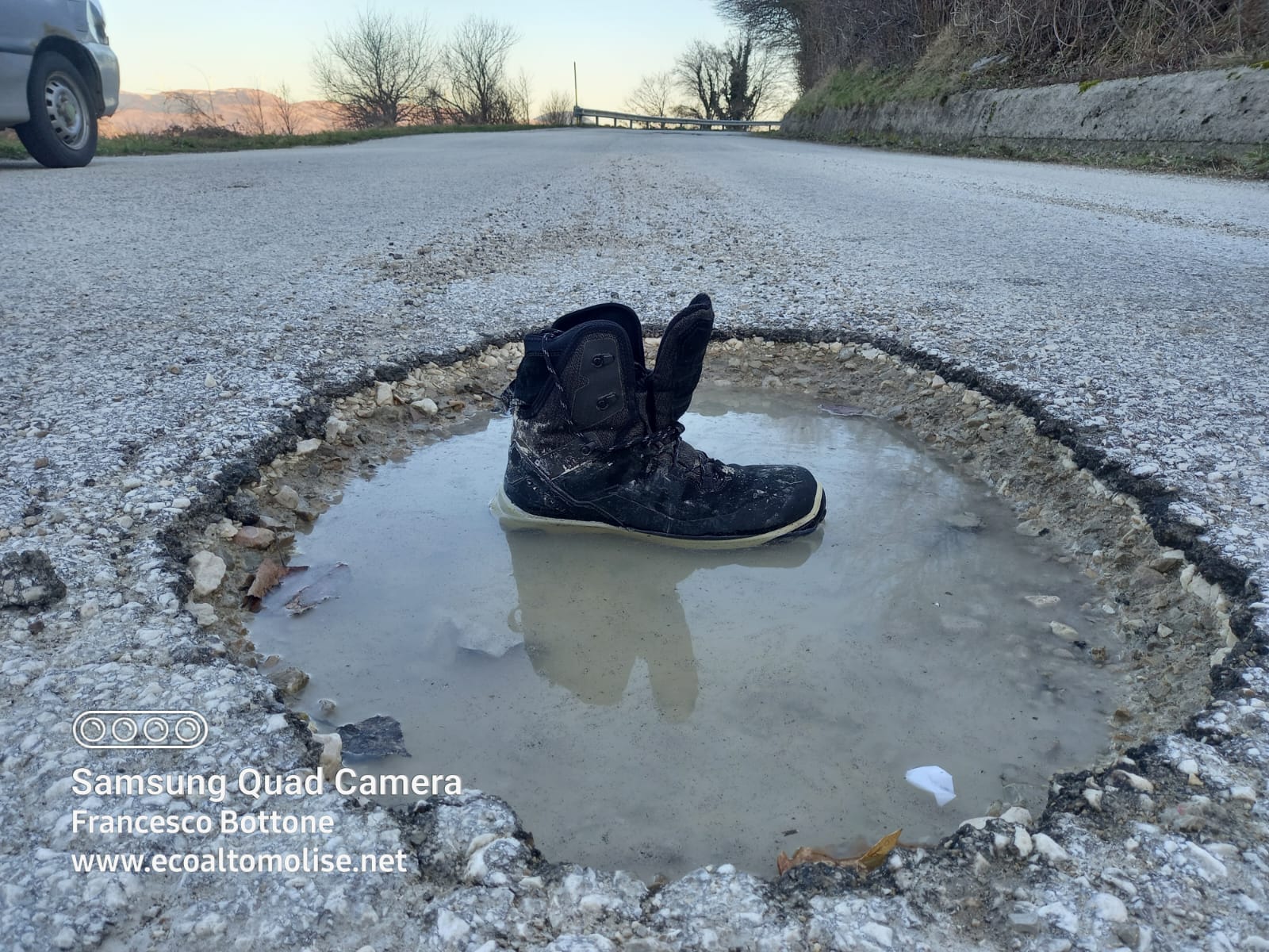 «È circolare, potrebbe essere un cratere da impatto. Manderò la foto al gruppo degli astrofili frentani». Il commento, ironicamente polemico, arriva da un automobilista che nei giorni scorsi ha avuto la sventura di percorre la ex statale Istonia, l’ormai famosa 86 dir altrimenti detta “mulattiera”, nel tratto più in quota, cioè quello che collega l’Alto Vastese, da Castiglione Messer Marino, all’Alto Molise, passando per il territorio di Belmonte del Sannio fin verso Agnone o più su dove osa solo Capracotta.