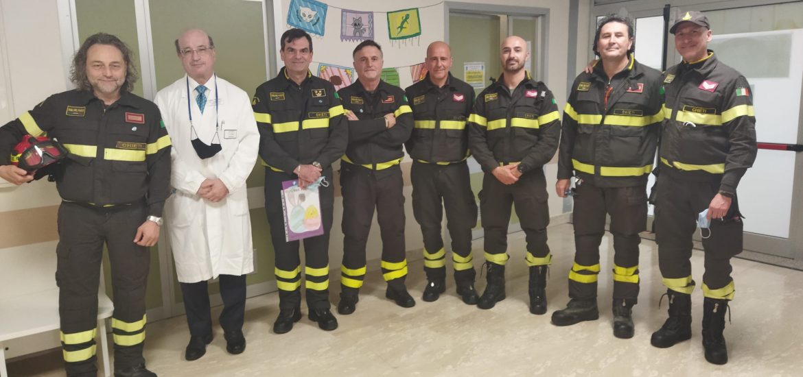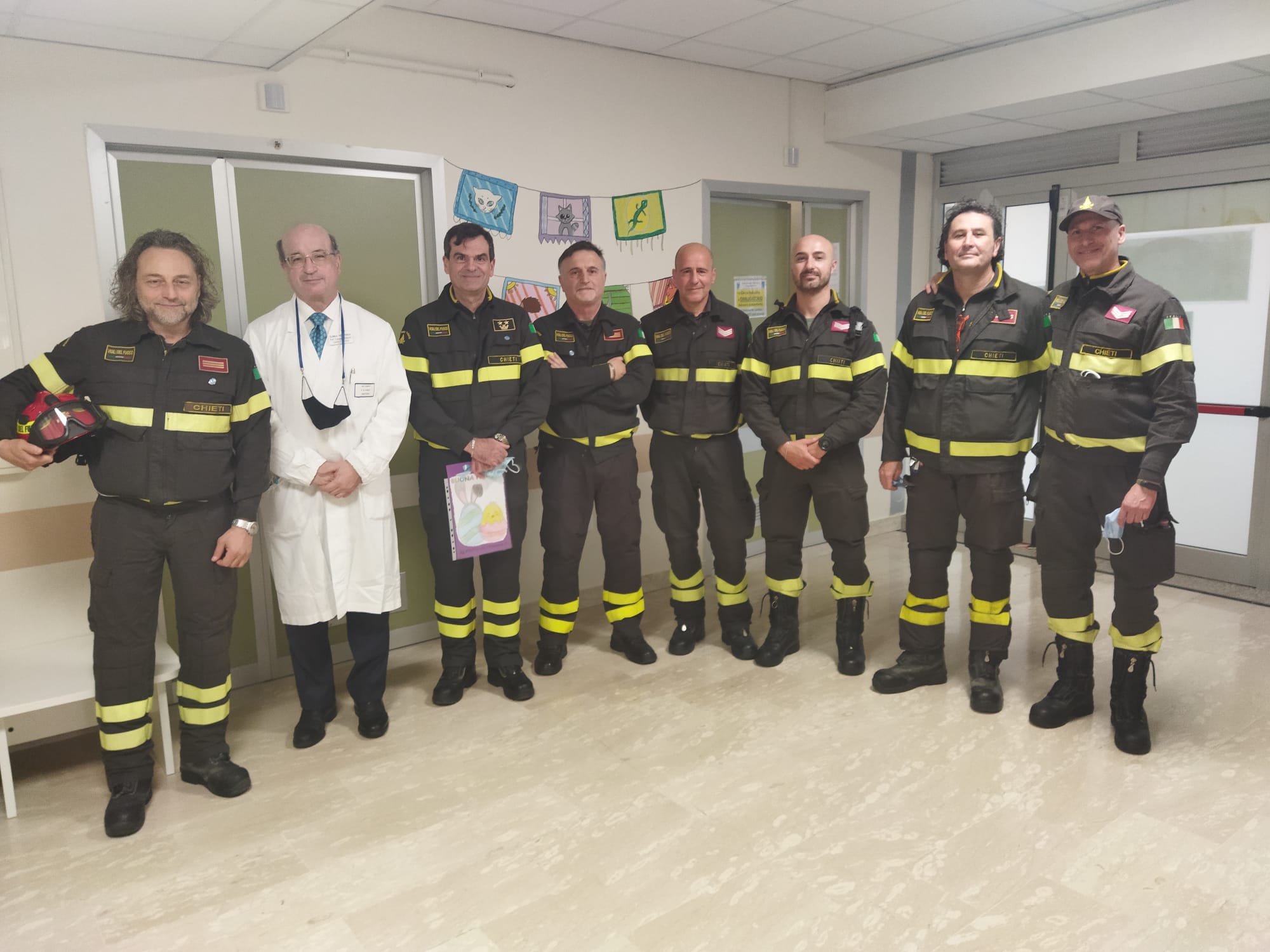Doppia sorpresa, questa mattina, per i bambini ricoverati in Clinica Pediatrica a Chieti. Una nutrita delegazione dei Vigili del Fuoco è arrivata in reparto con un carico di uova di Pasqua, e nel consegnarle ai piccoli pazienti è stato anche formulato l’invito a visitare la caserma per vedere da vicino i mezzi e gli ambienti di lavoro di un Corpo che ha un posto speciale nel cuore di tutti, impegnato com’è nella tutela dell’incolumità delle persone e l’integrità dei beni.