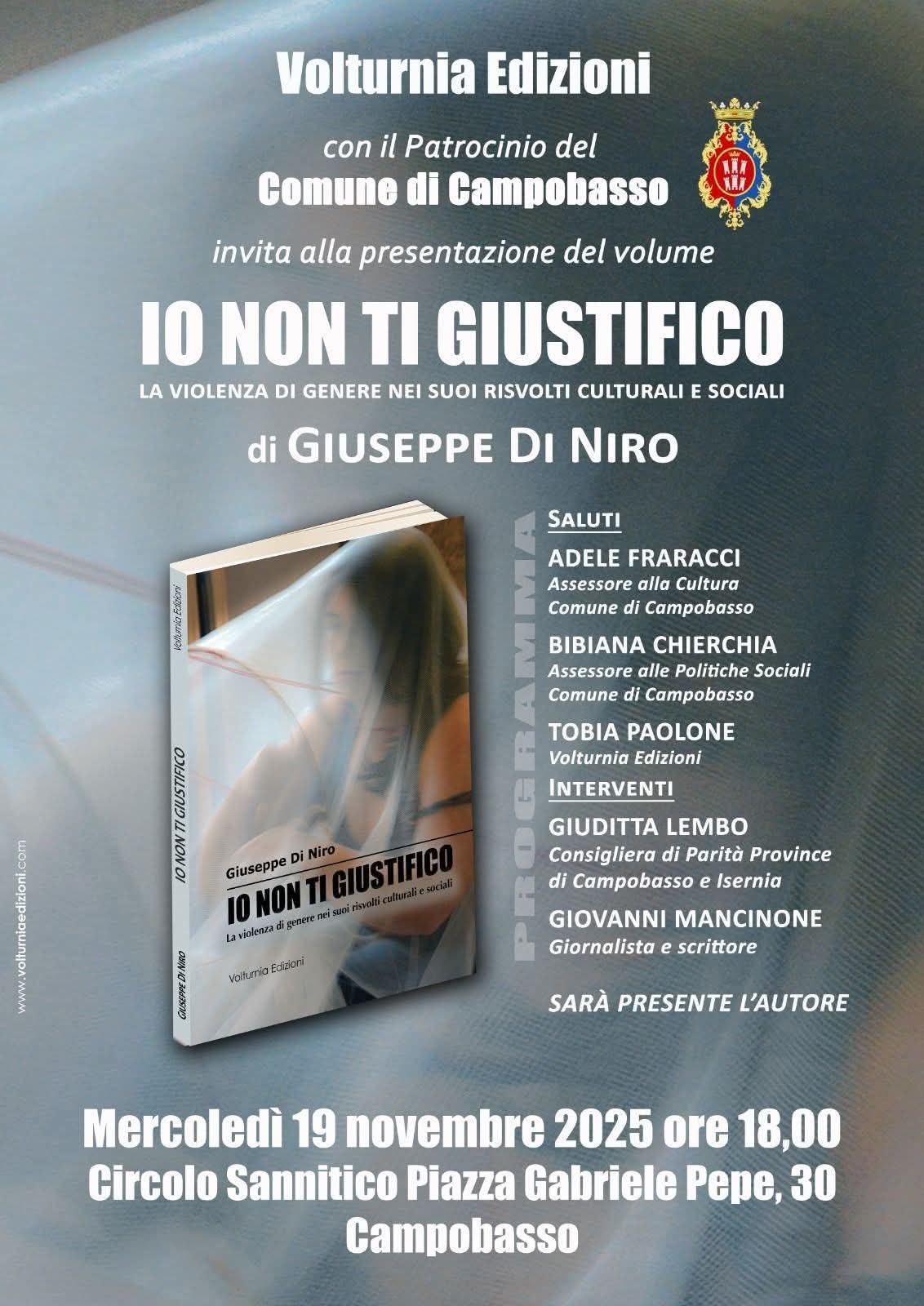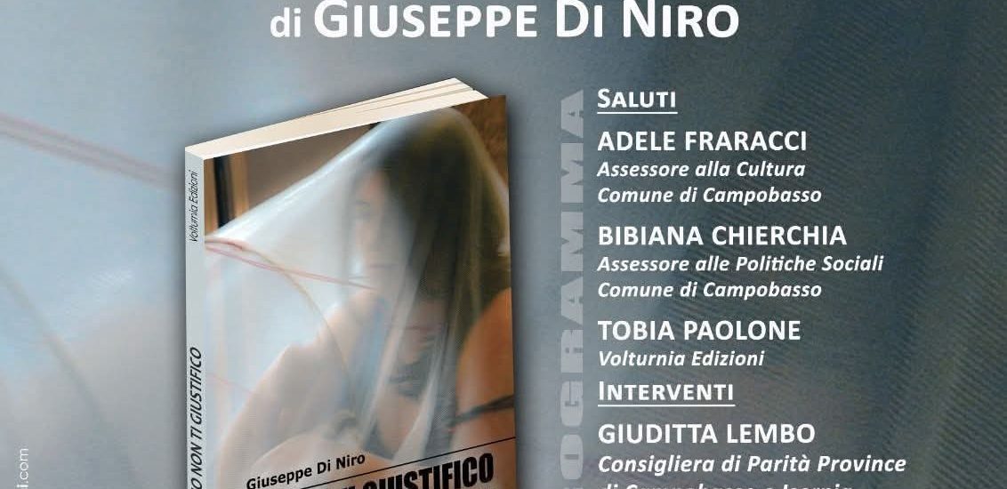 “Io non ti giustifico” è il titolo del libro di Giuseppe Di Niro, assistente sociale e attento osservatore dei mutamenti sociali e dei comportamenti delle persone con particolare attenzione alle tematiche che riguardano il vissuto delle famiglie. Il libro edito da Volturnia edizioni verrà presentato a Campobasso, al Circolo Sannitico, mercoledì 19 novembre con inizio alle ore 18.