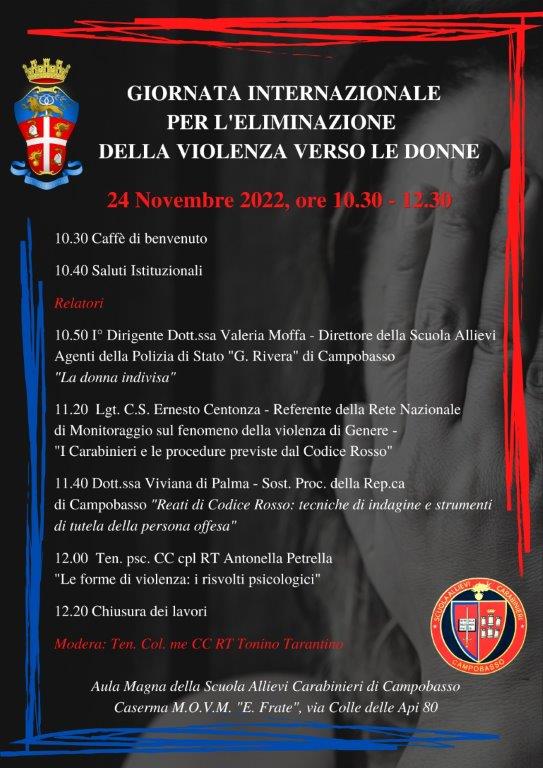 L’evento che si svolgerà alla presenza delle Autorità civili e militari della Regione edei 500 Allievi Carabinieri frequentatori del 141° corso formativo, vedrà l’intervento della Dott.ssa Viviana Di Palma, Sostituto Procuratore della Repubblica di Campobasso, del 1° Dirigente Dott.ssa Valeria Moffa, Direttore della Scuola Allievi Agenti della Polizia di Stato “G. Rivera” di Campobasso, del Tenente Antonella Petrella, psicologa e psicoterapeuta del Comando Scuola Allievi Carabinieri e del Luogotenente C.S. Ernesto Centonza, Referente della Rete Nazionale di Monitoraggio sul fenomeno della violenza di Genere, del Comando Provinciale Carabinieri di Campobasso.
