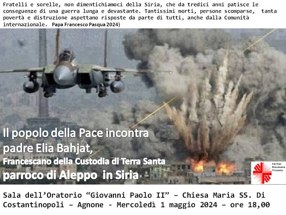 In occasione della Pasqua fu lo stesso Papa Francesco a lanciare all’umanità questo monito: «Fratelli e sorelle, non dimentichiamoci della Siria, che da tredici anni patisce le conseguenze di una guerra lunga e devastante. Tantissimi morti, persone scomparse, tanta povertà e distruzione aspettano risposte da parte di tutti, anche dalla comunità internazionale». E proprio in quest’ottica si inserisce l’iniziativa culturale della Caritas diocesana che ha così il privilegio di poter ospitare ad Agnone il parroco di Aleppo. La popolazione in Siria sta soffrendo le conseguenze della guerra ormai più che decennale, aggravate dalle sanzioni, dal terremoto dei mesi scorsi ed ora è coinvolta anche nella guerra fra Israele e Palestina. La testimonianza del religioso francescano saranno un utile spunto di riflessione per tutta la comunità agnonese.