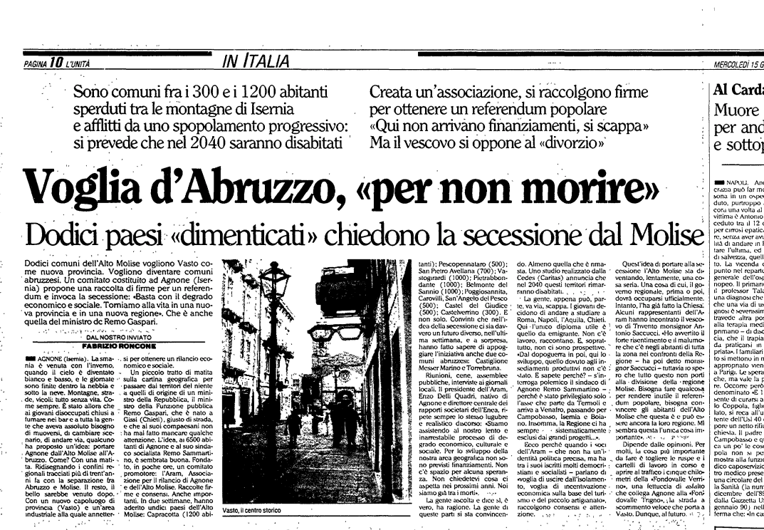 Voglia di Abruzzo, per non morire. Un titolo eloquente quello dedicato 30 anni fa da l’Unità per rimarcare la voglia di secessione dei paesi dell’alto Molise nei confronti della Regione. Un sentimento mai sopito che nel 1992 portò ad un passo dall’indire il referendum popolare di dodici comuni (Agnone, Capracotta, Pescopennataro, San Pietro Avellana, Vastogirardi, Pietrabbondante, Belmonte del Sannio, Poggio Sannita, Carovilli, Sant’Angelo del Pesco, Castel del Giudice, Castelverrino) stufi di subire scelte regionali che penalizzavano solo ed esclusivamente l’intera area al confine tra Molise e Abruzzo. A descrivere l’idea, di fatto mai attuata, fu l’inviato Fabrizio Roncone che tramite la sua penna rilanciò l’iniziativa sposata dall’Aram, Associazione per il rilancio di Agnone e dell’alto Molise, che coinvolgeva amministrazioni e cittadini dalle più disparate connotazioni politiche.
