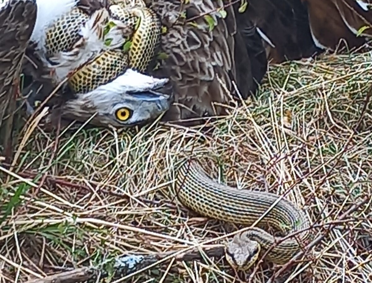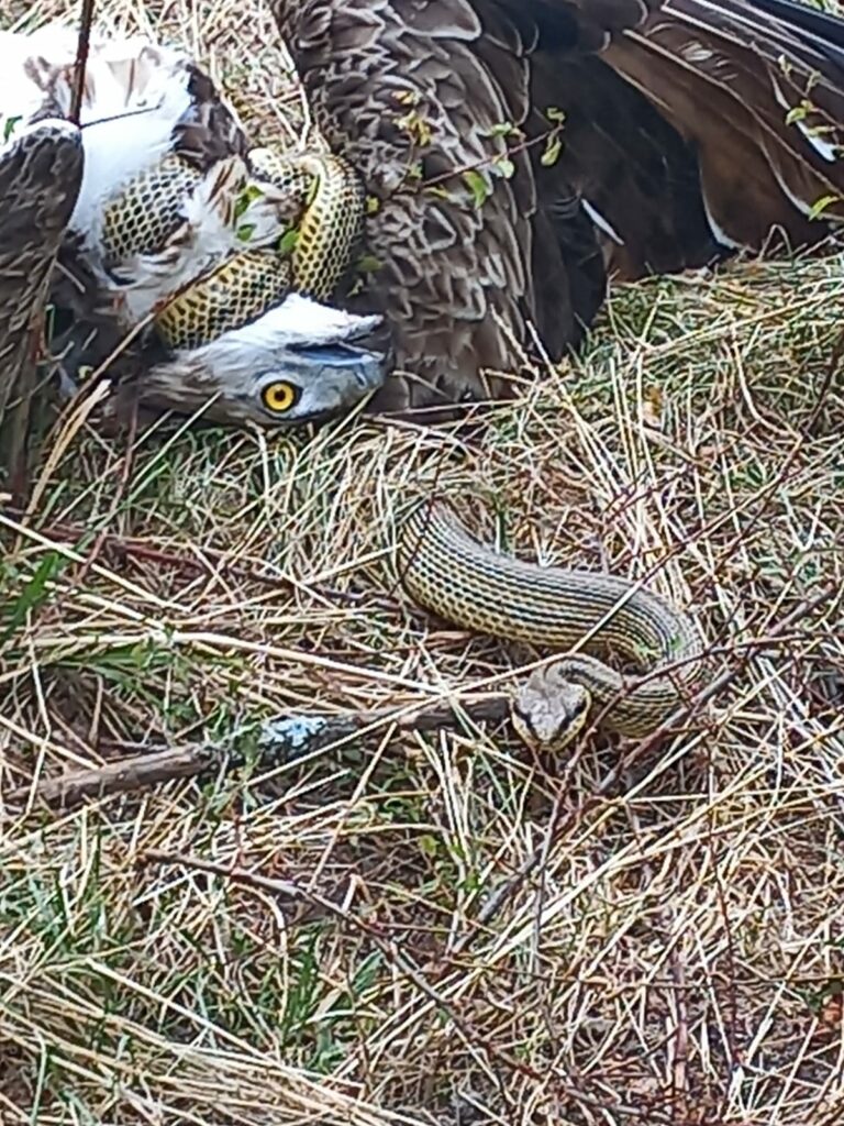 Le immagini spettacolari che offriamo ai lettori, per gentile concessione dei Forestali, scattate in località Falascoso ad oltre mille metri di altitudine, mostrano un serpente, presumibilmente un biacco, nome scientifico Hierophis viridiflavus, o più probabilmente un cervone, nome scientifico Elaphe quatuorlineata, che si è difeso efficacemente dall’attacco di un rapace, molto probabilmente un biancone, nome scientifico Circaetus gallicus, detto anche e non a caso “aquila delle serpi”. Solitamente è il rapace che attacca e uccide il serpente, per poi cibarse; mentre ieri i ruoli si sono invertiti e la preda ha ucciso il predatore soffocandola in una stretta attorno al collo che è risultata mortale.